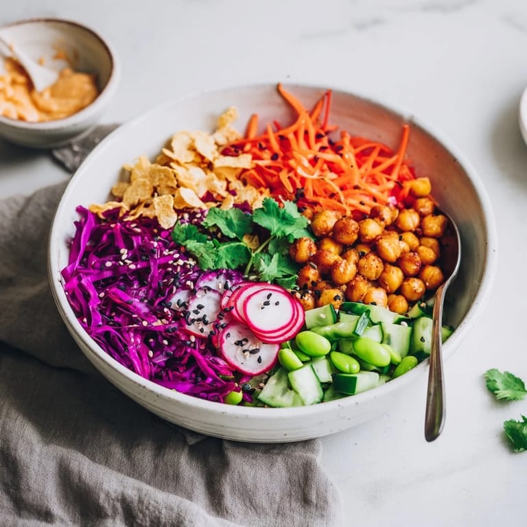 - Top each bowl with roasted chickpeas, crispy rice puffs or cornflakes, toasted pumpkin seeds, and sliced radishes.
