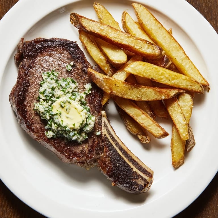 Pin this A classic steakhouse favorite featuring perfectly seared steak topped with rich garlic-herb butter, served with crisp golden fries.
