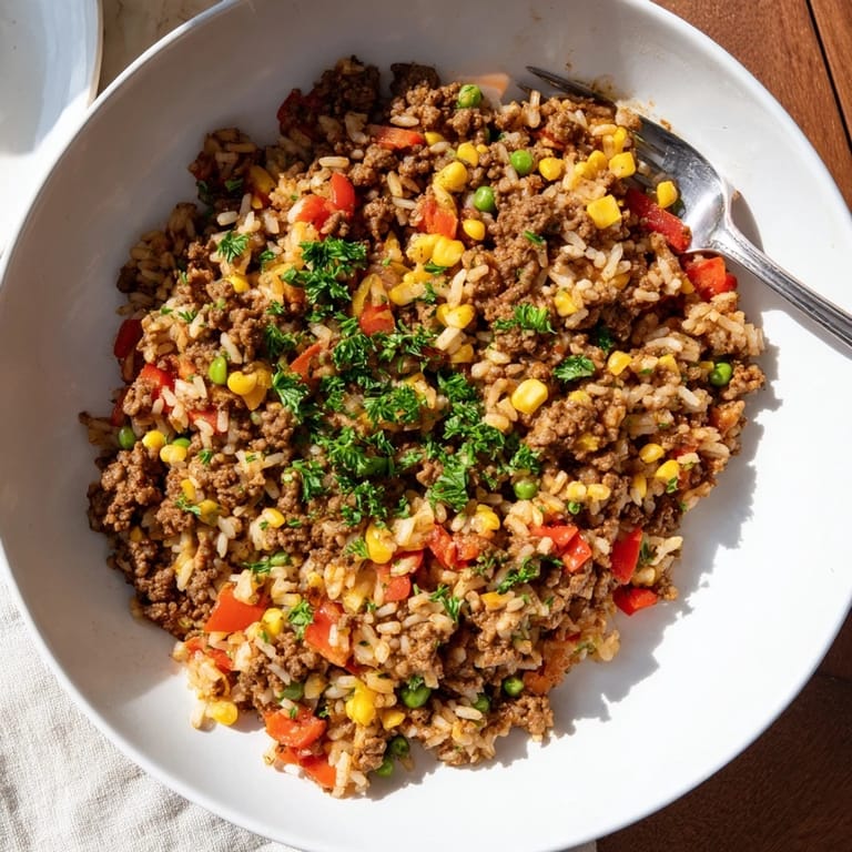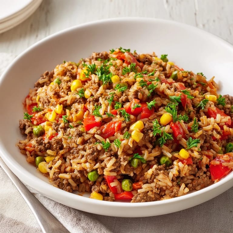 Pin this A hearty, budget-friendly one-pan meal featuring ground beef or turkey, colorful vegetables, and fluffy rice cooked together for easy cleanup and maximum flavor.