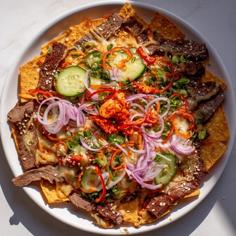 Pin this The first time I served Korean BBQ nachos at a casual dinner party, I watched my friends' faces light up in that perfect moment when familiarity meets surprise. Someone had brought leftover gochujang from their fridge, and I realized it was begging to meet crispy tortilla chips instead of the usual banchan lineup. What started as kitchen improvisation became the dish everyone asked me to make again, proving that the best recipes sometimes come from happy accidents.