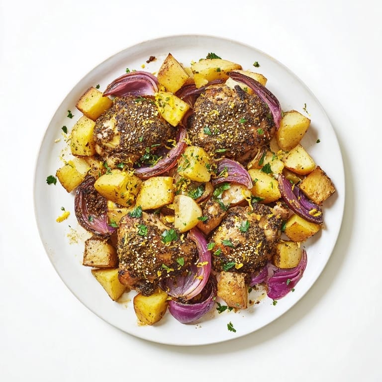 Pin this A vibrant, aromatic dish featuring crispy chicken thighs and golden potatoes, tossed in fragrant zaatar and roasted to perfection a simple weeknight meal bursting with Middle Eastern flavors.