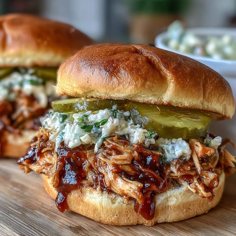 - Spoon a generous handful of pulled chicken onto each bun bottom, then add a small spoonful of slaw if you're using it, and one pickle slice for brightness. Press the top bun on gently so people can actually hold it without everything sliding out.