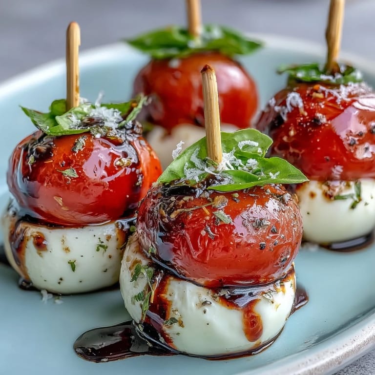 Add visual interest by using a mix of red and yellow cherry tomatoes for a more colorful presentation. For enhanced flavor, substitute regular mozzarella balls with marinated mozzarella, which adds herbs and garlic notes. You can also alternate the order of ingredients on the skewer or add a small cube of prosciutto between the tomato and mozzarella for a non-vegetarian version. For a different finish, try using a reduction of aged balsamic vinegar instead of balsamic glaze, or add a sprinkle of dried Italian herbs for extra aromatic depth.