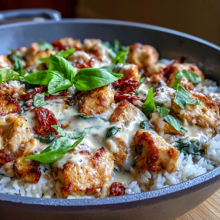 Pin this There's something about a one-pan dinner that shifts the entire evening—less cleanup, more time to actually enjoy the meal with someone you care about. I stumbled onto this Tuscan chicken rice skillet on a Tuesday when I had leftover sun-dried tomatoes and absolutely no energy for multiple dishes, and somehow it became the kind of meal that tastes fancier than the effort it requires. The cream mingles with the garlic and Parmesan into this silky sauce that coats every grain of rice, while the chicken stays impossibly tender throughout the cooking. It's the sort of dish that makes you feel like you've been to Italy without leaving your kitchen, and it's ready in under an hour.