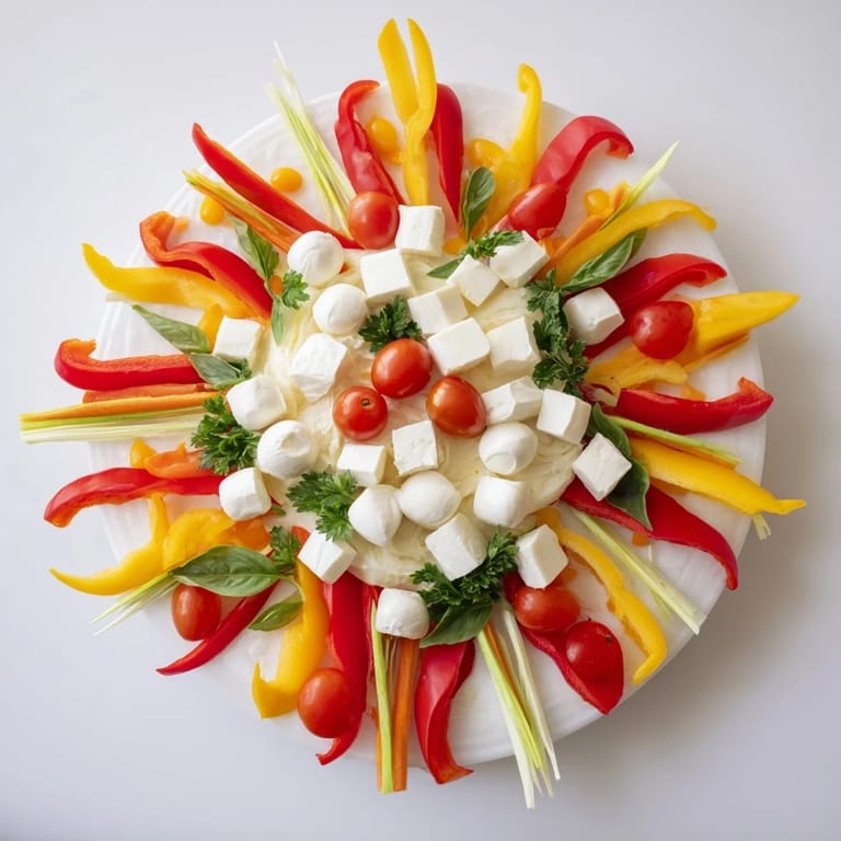 Take care when slicing the vegetables to maintain uniformity, especially the red bell pepper strips to create a clean petal effect. Using decorative shapes for the cucumber can elevate the visual impact. Prepare the platter shortly before serving, then chill to keep ingredients fresh and vibrant.
