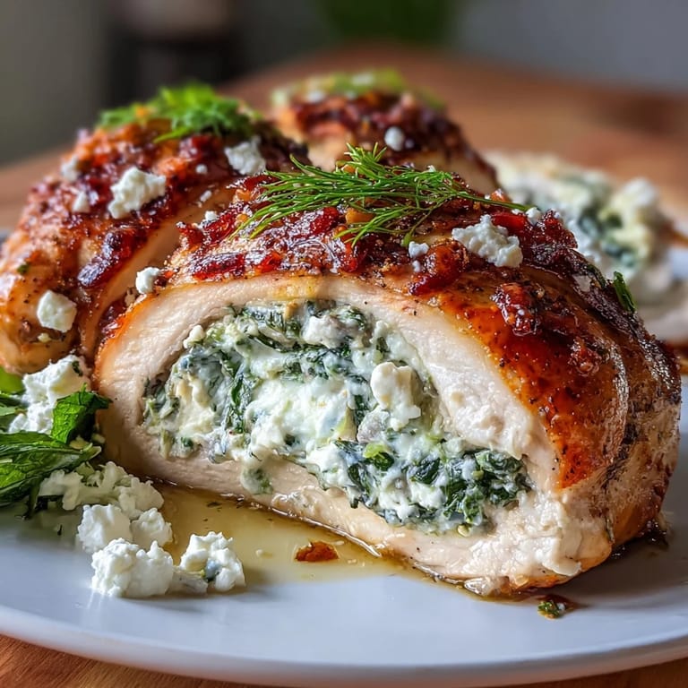 Pin this The secret to this dish lies in the filling. Chopped fresh spinach is combined with crumbled feta and softened cream cheese to create a luscious, creamy base. Minced garlic and optional sun-dried tomatoes add depth and a hint of sweetness, while fresh dill, dried oregano, and a touch of lemon zest brighten every bite. Each chicken breast is carefully pocketed, generously stuffed, then brushed with olive oil and dusted with paprika before going into a hot 400°F oven. The result is a beautifully golden exterior with a moist, flavorful center that will have everyone reaching for seconds.