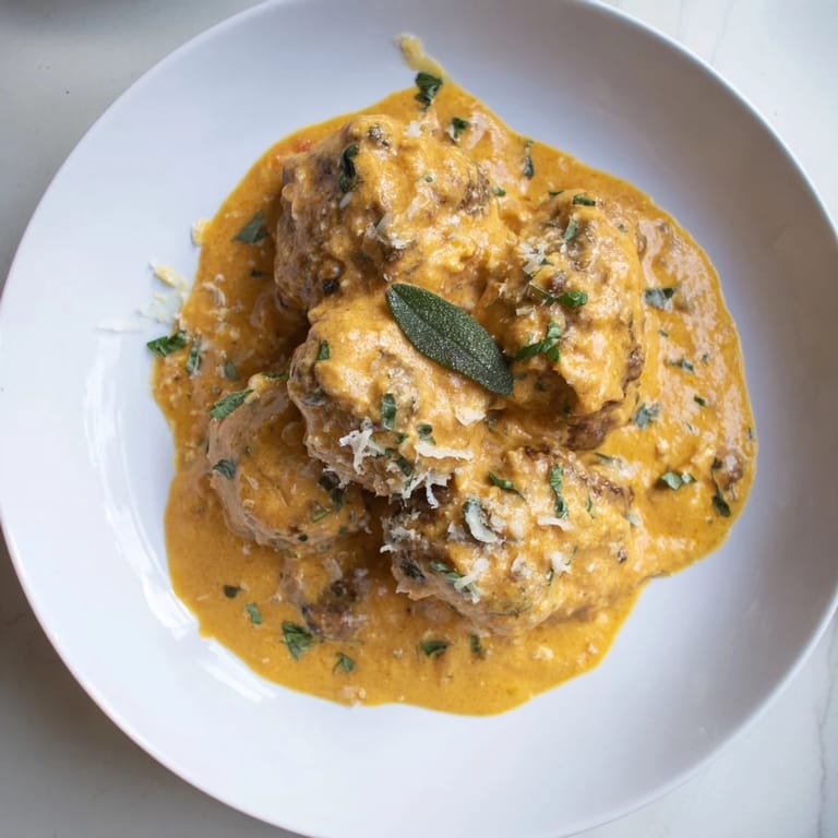 Pin this Tender turkey meatballs paired with a creamy, aromatic pumpkin sage sauce—perfect for a comforting autumn dinner.